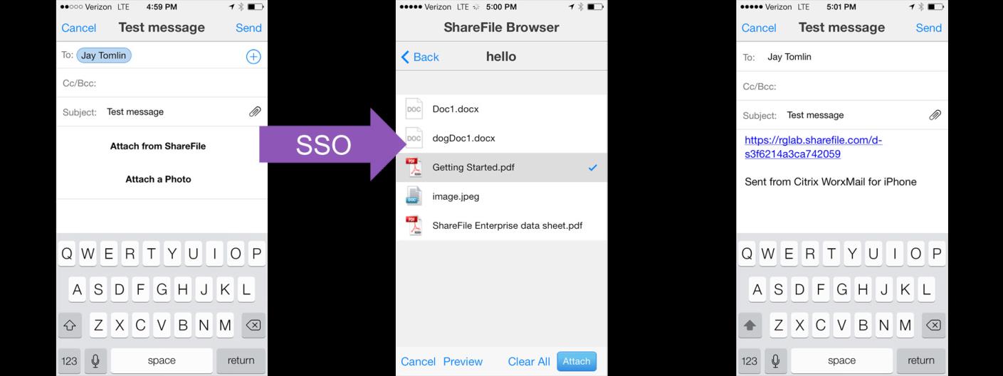 A XenMobile és a ShareFile közötti integráció és egypontos bejelentkezés lehetővé teszi, hogy a felhasználók úgy tudjanak fájlokat csatolni a ShareFile tárhelyről a Citrix WorxMail biztonságos vállalati e-mail kliensben írt üzeneteikhez, hogy a folyamat során ehhez nem kell letölteniük a fájlt a mobilkészülékre, és nem kell bejelentkezniük a ShareFile-ba. A felhasználók ShareFile hivatkozásokat illeszthetnek be a XenMobile naptári meghívóikba, hogy a meghívottak is hozzáférjenek a dokumentumokhoz.