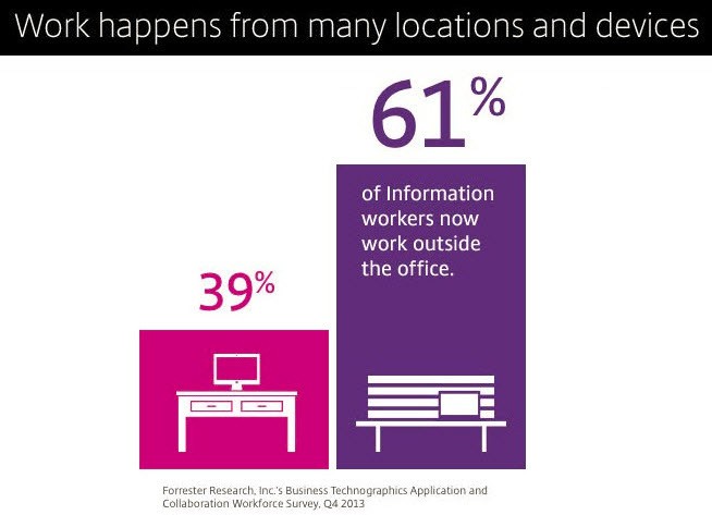 A munkavégzés sokféle helyszínről és készülékről történik, az információs dolgozók 61%-a ma már az irodán kívül dolgozik