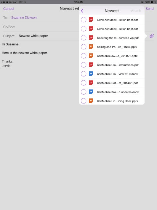 2. ábra: A ShareFile a WorxMaillel való integrált működése révén támogatja a mobil tartalomkezelést A dolgozók a fiókjukból fájlokat csatolhatnak az üzenetekhez, és biztonságos hivatkozások formájában küldhetik el azokat. Az adatokat érintő költségek csökkennek, mivel a csatolt fájl hivatkozássá konvertálódik, amelyre a címzett rákattint, és letöltheti a fájlt.