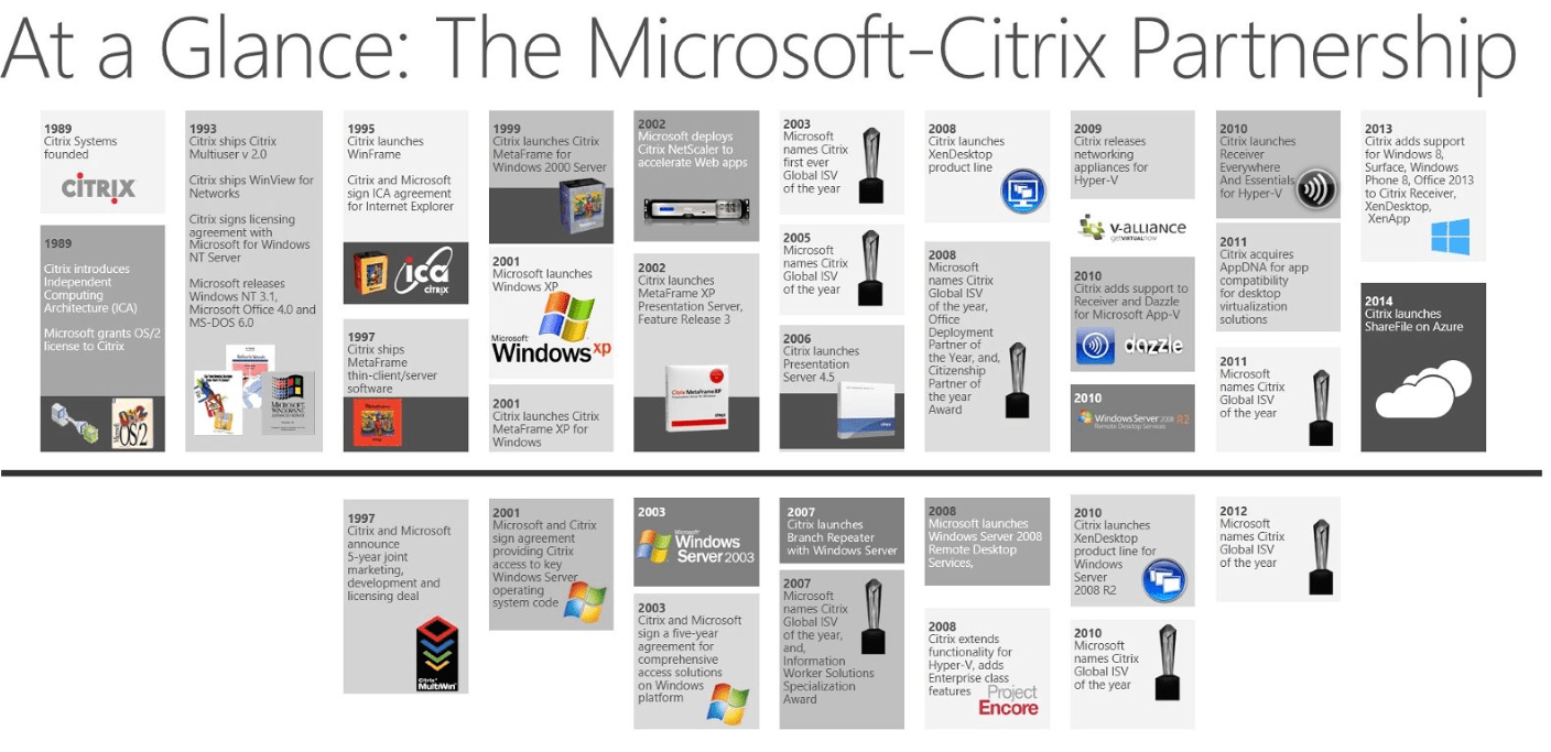 Kattintson a lenti képre, hogy áttekinthesse a Citrix és a Microsoft stratégiai kapcsolatát a Citrix 1989-es megalakulásától, napjainkig.