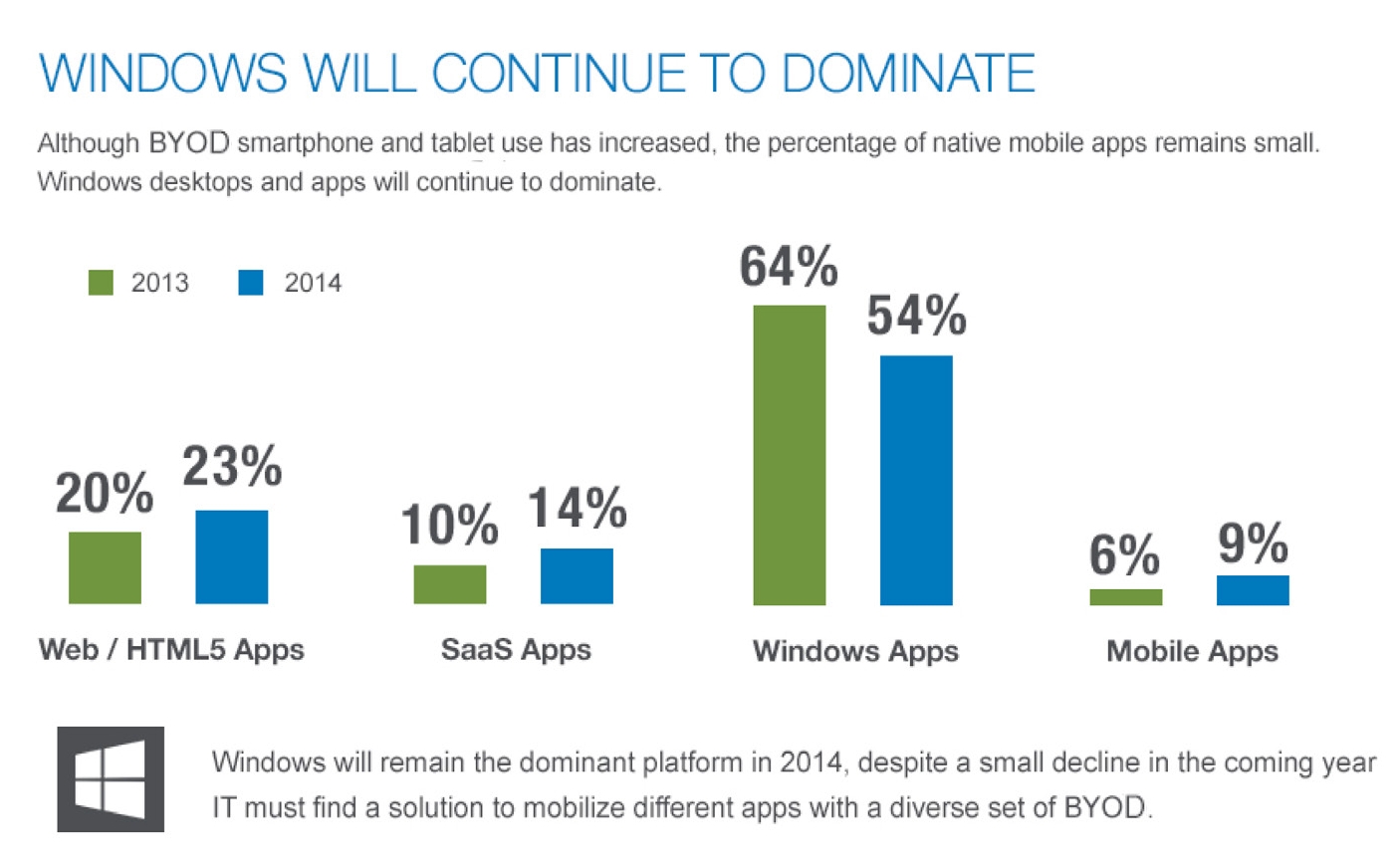 Míg a vállalatok olykor visszatérnek a hagyományos telefonok és BlackBerry-készülékek beszerzéséhez, más cégek előszeretettel vásárolnak táblagépeket vegyes célú használatra, illetve asztali gépek helyettesítésére. Például a kisméretű asztali gépek és az elérhető árú, kulcsrakész Androidos készülékek vegyes használata serkentőleg hat a saját mobilszolgáltatások, pl. az intézmény területéről nem kivihető orvosi készülékek fejlesztésére.